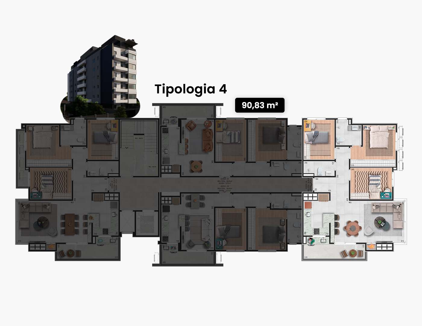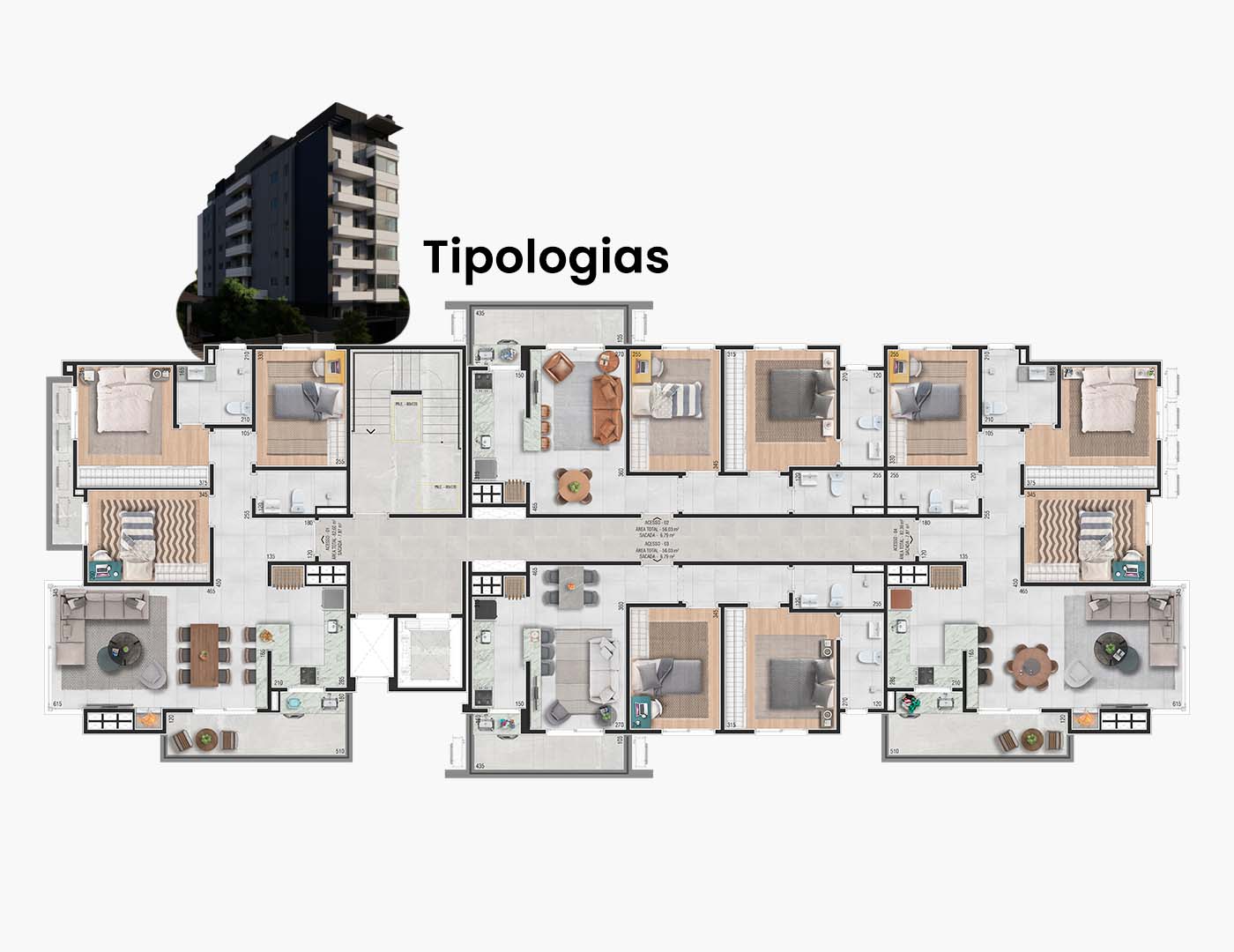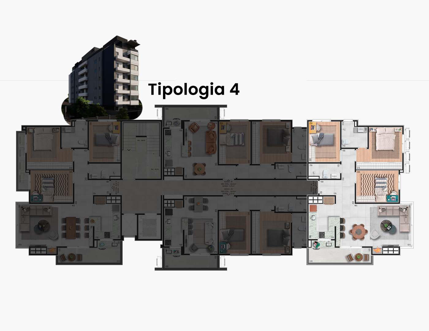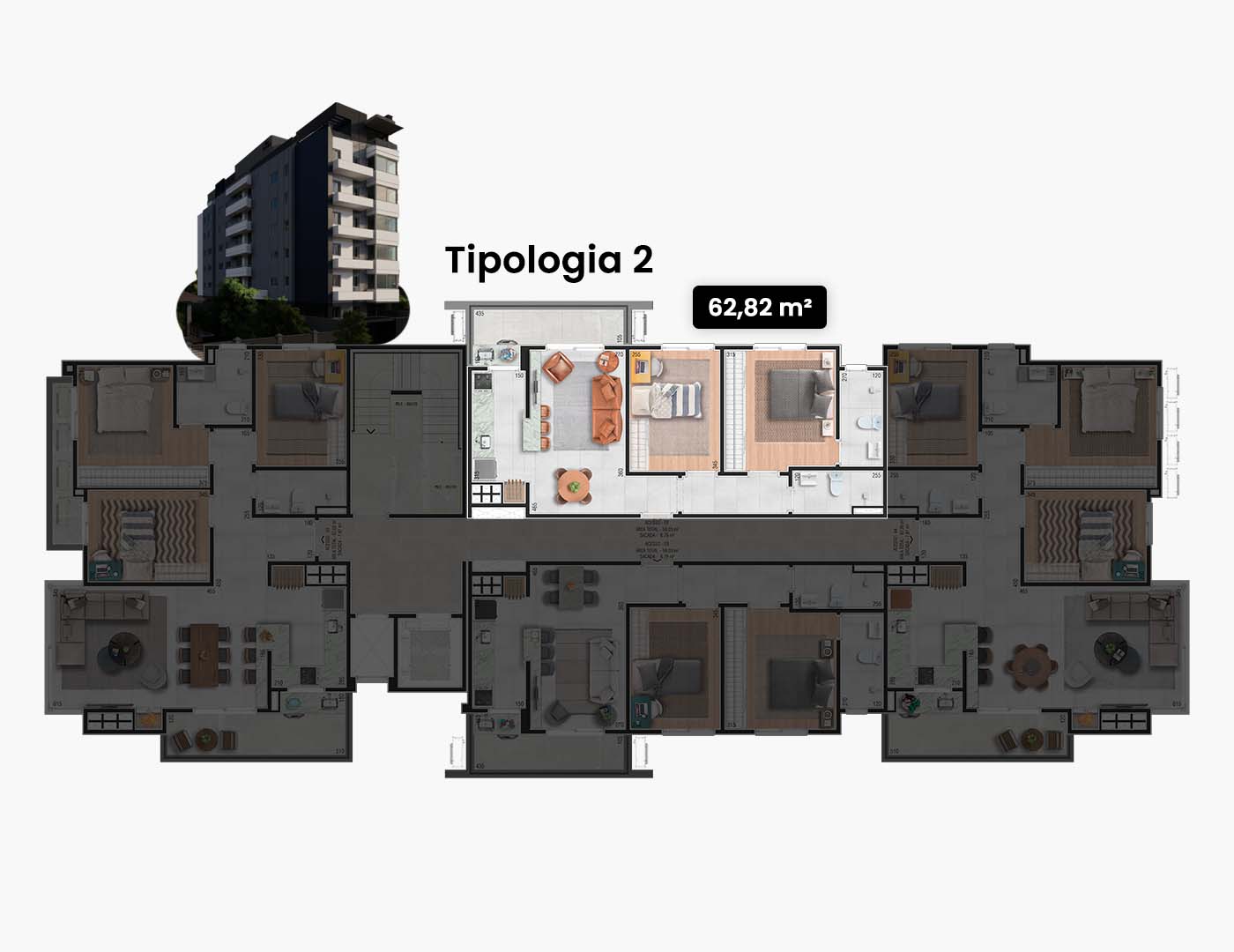 Apartamentos de 2 dormitórios sendo uma suíte, banheiro social, sala e cozinha integradas, churrasqueira e lavanderia. Posição norte e sul.