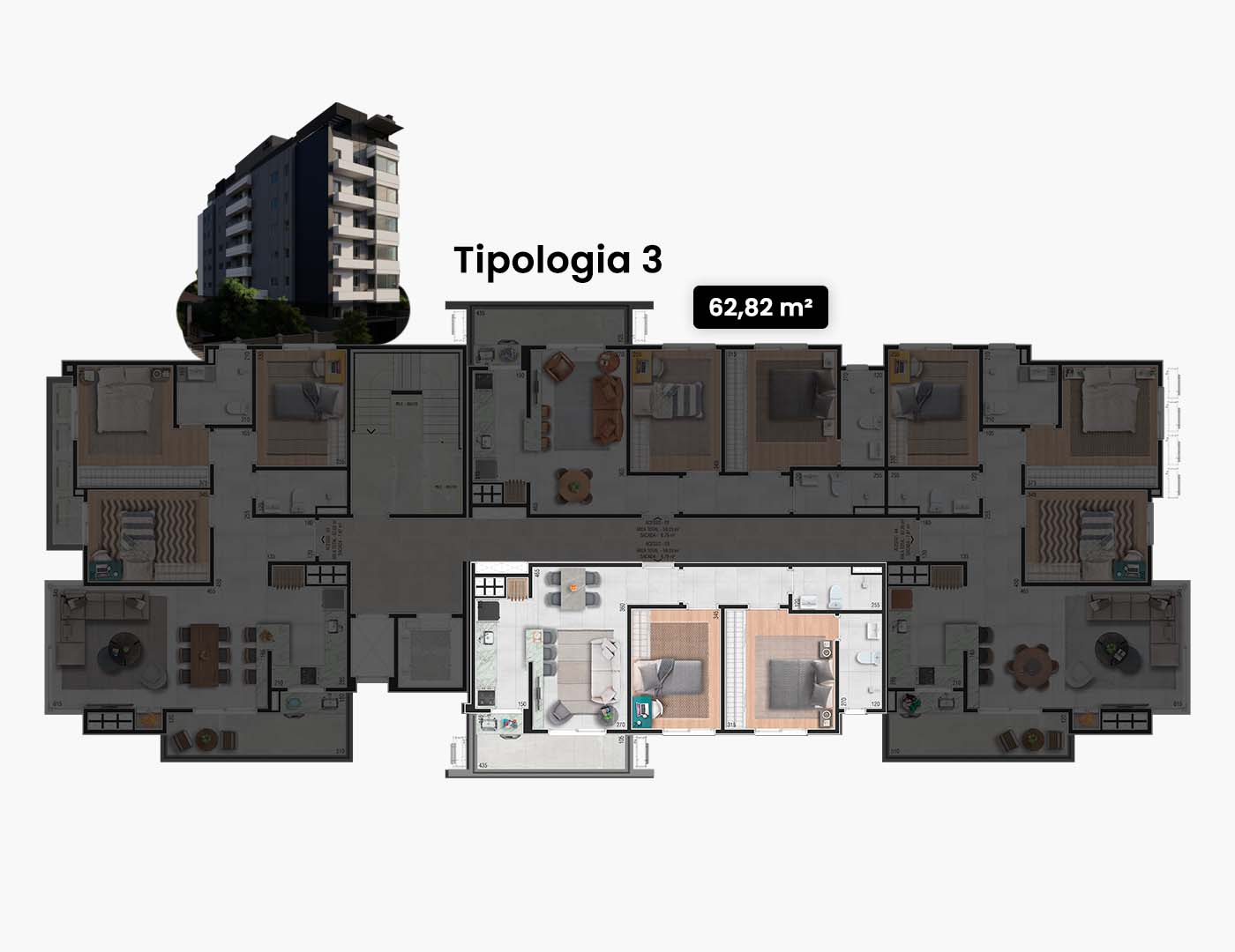 Apartamento de 3 dormitórios sendo uma suíte, banheiro social, sala e cozinha integradas, lareira, churrasqueira e lavanderia. Posição leste.